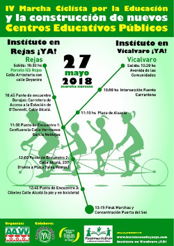 Un año más, y van cuatro seguidos, las asociaciones vecinales de la región impulsan este domingo, 27 de mayo, una manifestación en bicicleta y a pie que tiene el objetivo de demandar equipamientos educativos dignos y suficientes para atender la actual demanda de las familias madrileñas. Demandas que suenan ya clásicas como la construcción de nuevos colegios e institutos públicos en los ensanches de nuestras ciudades, el freno de la masificación, la finalización de una vez por todas de los centros que se están construyendo por fases, la ampliación del número de plazas e institutos de FP o la mejora de las instalaciones y del mantenimiento cotidiano de muchos centros veteranos.