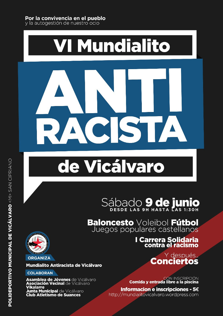 El próximo SÁBADO 9 de Junio un año más desde las 9h de la mañana hasta la bien entrada la noche, se llevará a cabo la 6ª edición del Mundialito Antirracista por la convivencia y un ocio alternativo en Vicálvaro.