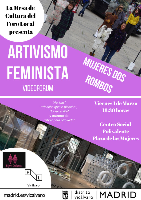 Este Viernes 1 de Marzo a las 18:30 en el Centro Social Polivalente (Pza. de las Mujeres 14-Casco Hª Vicálvaro), con motivo de la cercanía del día #8M de los derechos de las Mujeres, se llevará a cabo el videoforum organizado por la mesa de cultura de los Foros Locales de Vicálvaro donde se proyectarán los cortos sobre acciones del colectivo«Mujeres de dos Rombos»: